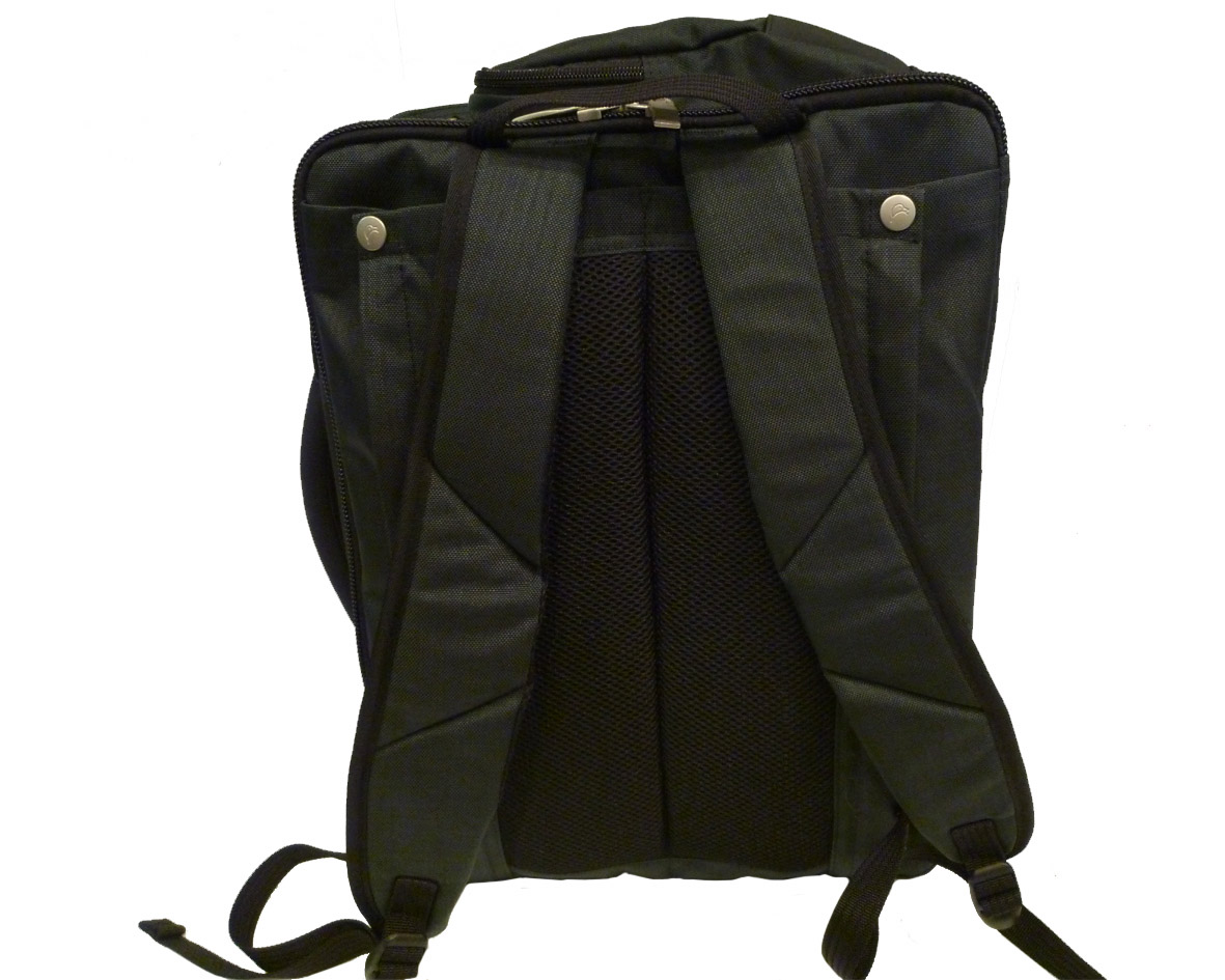 背面部分には、両サイドにボタンとファスナーが取り付けられており、こちらのファスナー、ボタンを外して頂くと、リュックサックの肩ヒモが収納されており、従来のリュック使用ですと、下部にある金具で留めなければなりませんでした、取り付けが大変で、さっと素早くリュックにすることが大変でしたので、このような仕様に変えています。