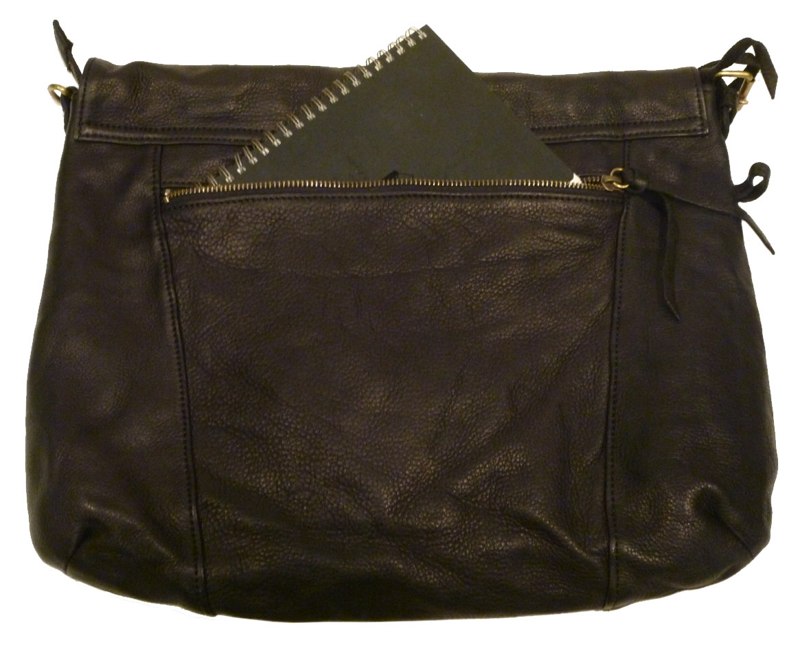 背面にあるポケットには、A6サイズのノートが入るサイズで、ポケットは、下にいくにつれて細くクビレのあるるデザインに。