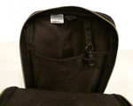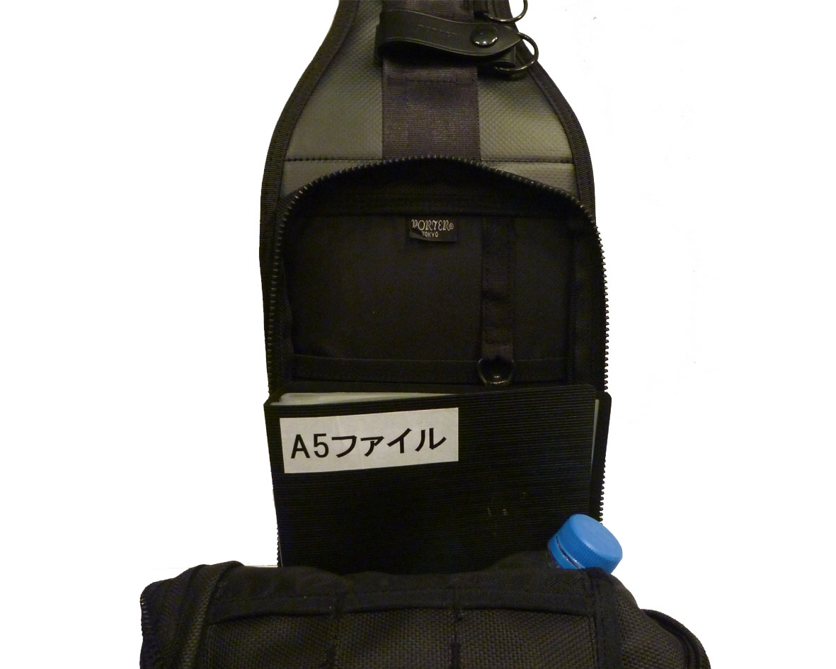 メイン収納部分につながるファスナーは、ラウンドファスナー式になっており、見やすく出し入れがしやすい仕様になっています。中にはA5ファイルがジャストに収まり、500mlペットボトルを入れられる位のマチ幅があります。また、奥にはゴムメッシュのポケットとキーなどを付けておくのに丁度いいストラップ付き。