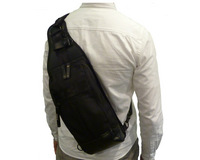 こちらの商品には、背面部分にメッシュをあしらい、中にモノを詰めても身体に当たる負担を軽減します。背面にあるポケットには、携帯などの電子機器を入れておける工夫がしてあります。また、右かけ左かけどちらでもして頂けるようにDカンと呼ばれる金具を両サイドに付けています。