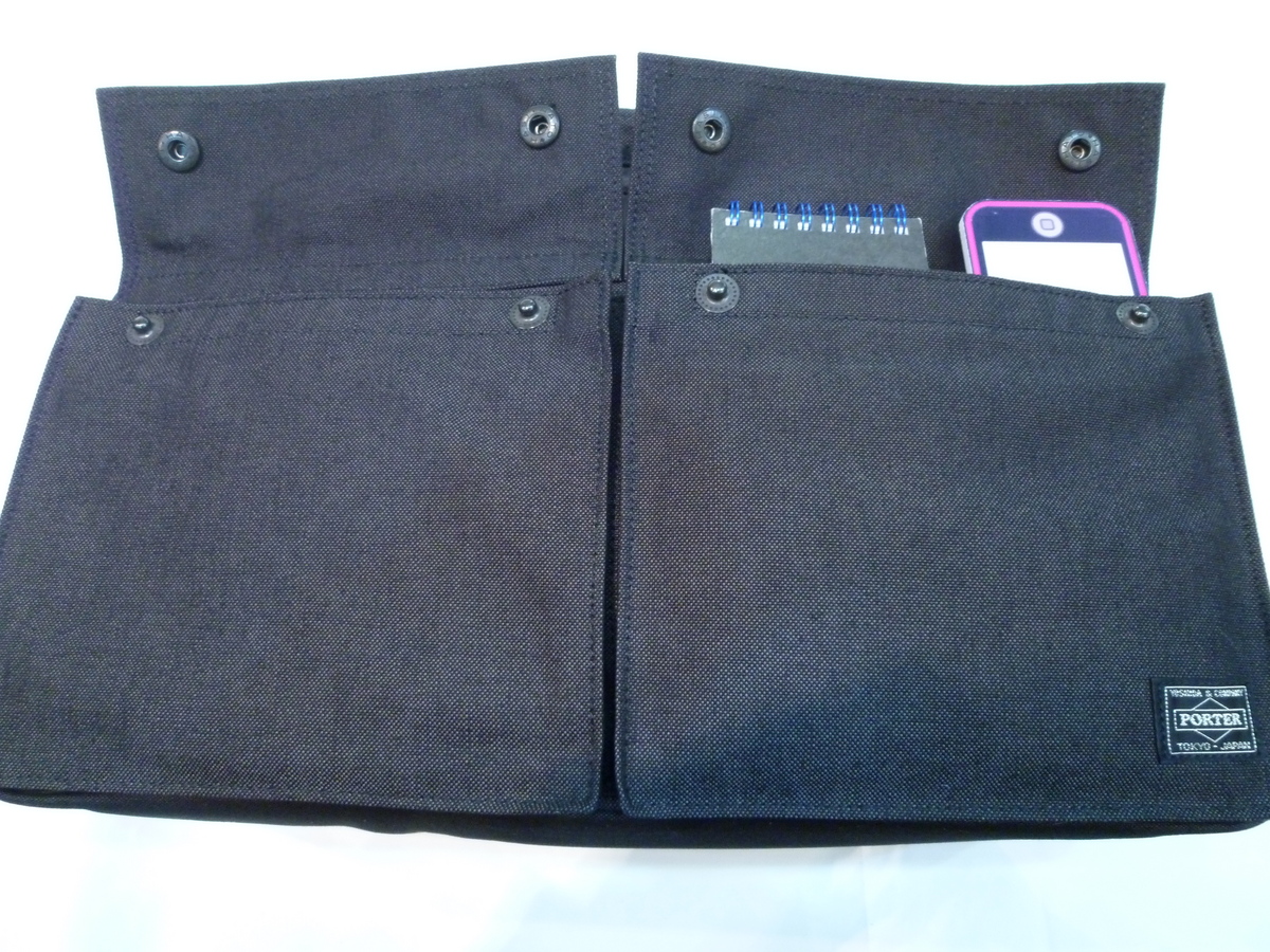 内装ポケットの上部にはポーターオリジナルのタグが。前面ポケットの右ボタンには、ポーターのブランドタグが付けられています。