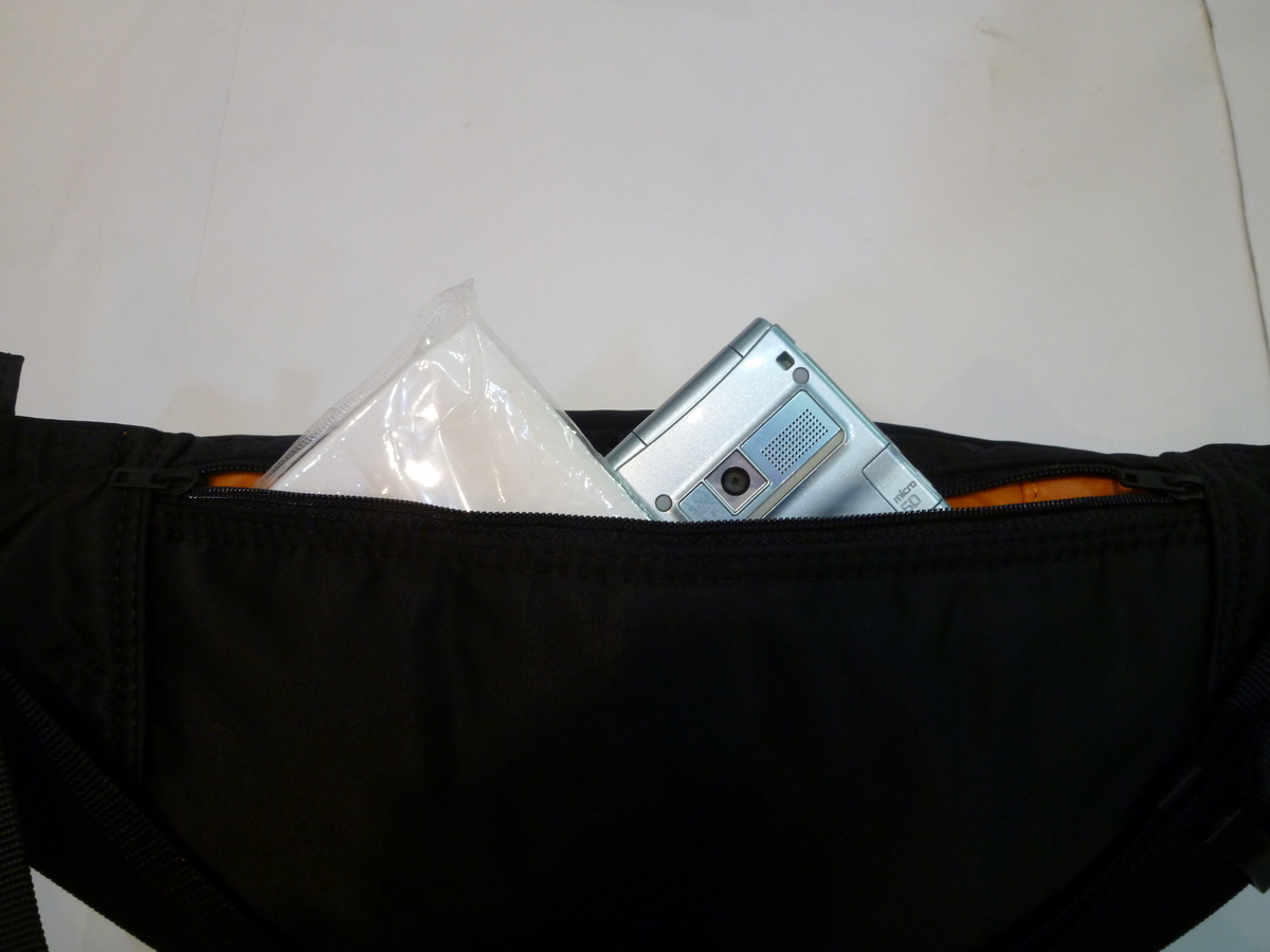 こちらは、外側にマジックテープ式のポケットと、ファスナー式のポケットがあり、更に奥に収納部分があります。ファスナーポケットのファスナーを開けると、携帯やメモ帳などの小物を収納可能なポケットが備え付けられており、あまり荷物を持たない人には丁度いい大きさです。